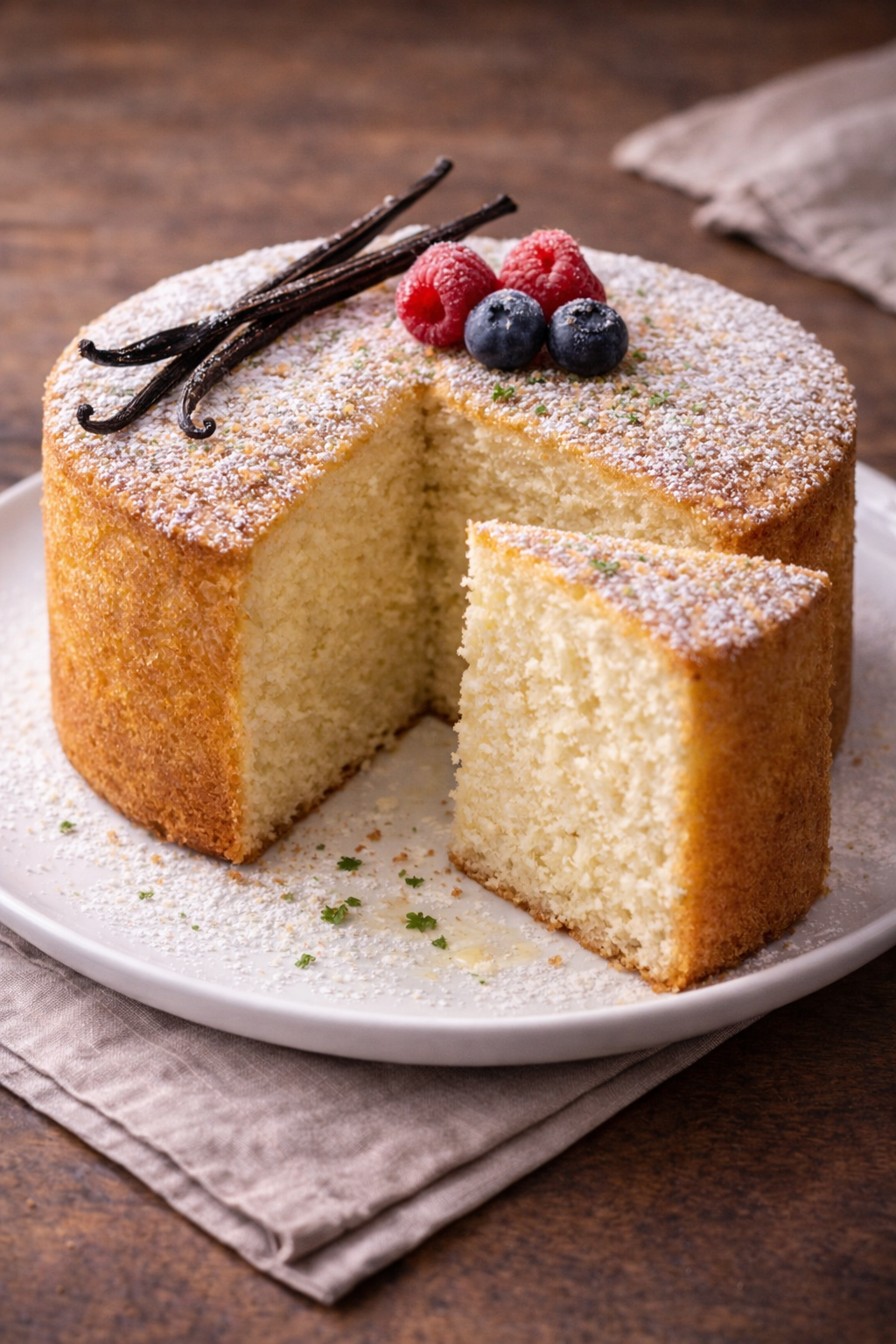 El bizcocho de vainilla esponjoso presenta una miga ligera, aireada y húmeda, con un aroma delicado y natural a vainilla. Su superficie queda ligeramente dorada, mientras que el interior es tierno y uniforme.