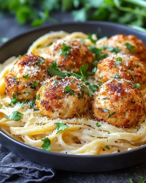 Este platillo es una combinación deliciosa de bolitas de pollo jugosas con un toque de ajo, acompañadas de una pasta cremosa y llena de sabor con parmesano. ¡Ideal para una comida reconfortante! 😋