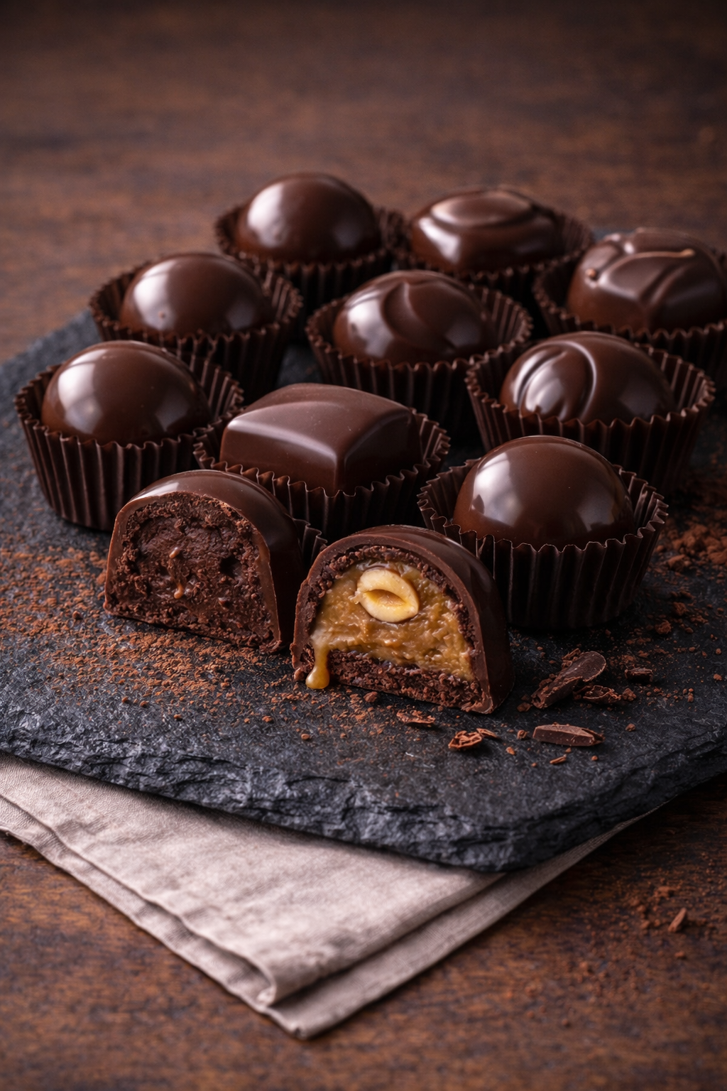 Los bombones de chocolate caseros presentan una cobertura brillante y firme que se rompe suavemente al morder, revelando un interior cremoso y delicado. El contraste entre la capa exterior y el relleno aporta una experiencia intensa y equilibrada.