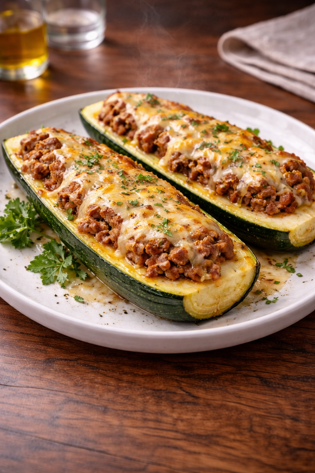 Sirve los calabacines rellenos directamente del horno al plato. Pueden presentarse solos como plato principal o acompañados de una ensalada fresca. Visualmente son atractivos, con un contraste claro entre el verde del calabacín y el dorado del queso gratinado.