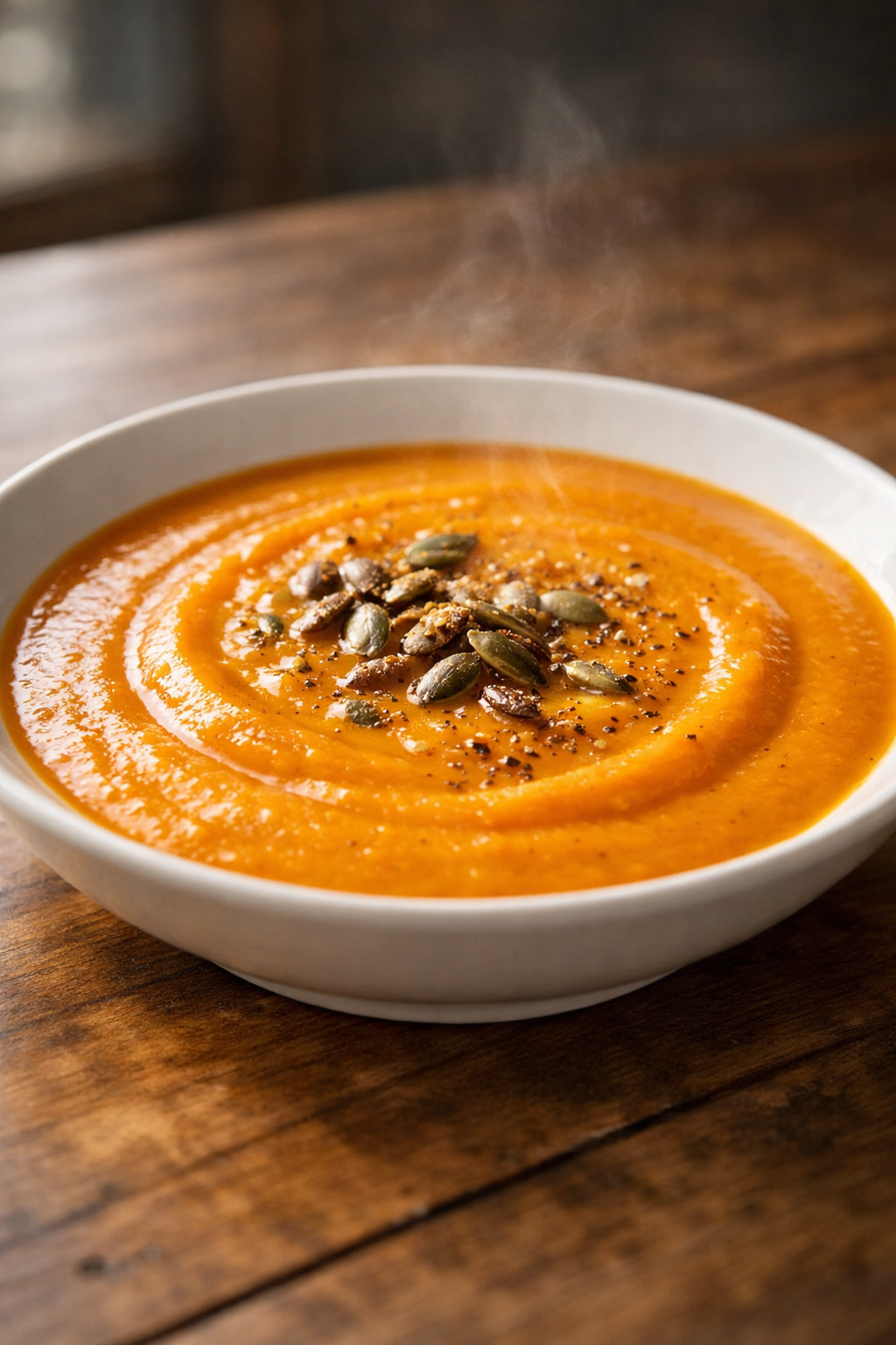 Sirve la crema bien caliente en platos hondos o cuencos. Puedes añadir semillas de calabaza tostadas para aportar contraste, un hilo de aceite de oliva para realzar el sabor o unos picatostes crujientes para jugar con texturas. Es un plato sencillo, pero con una presencia elegante y casera a la vez.