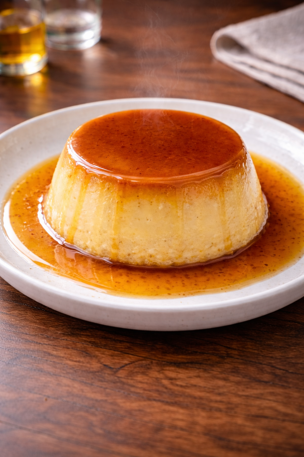 El resultado es un flan de textura sedosa, suave y cremosa, con un equilibrio perfecto entre dulzor y ligereza. Al desmoldarlo, el caramelo líquido cae lentamente sobre la superficie, creando una capa brillante que realza su aspecto y sabor.