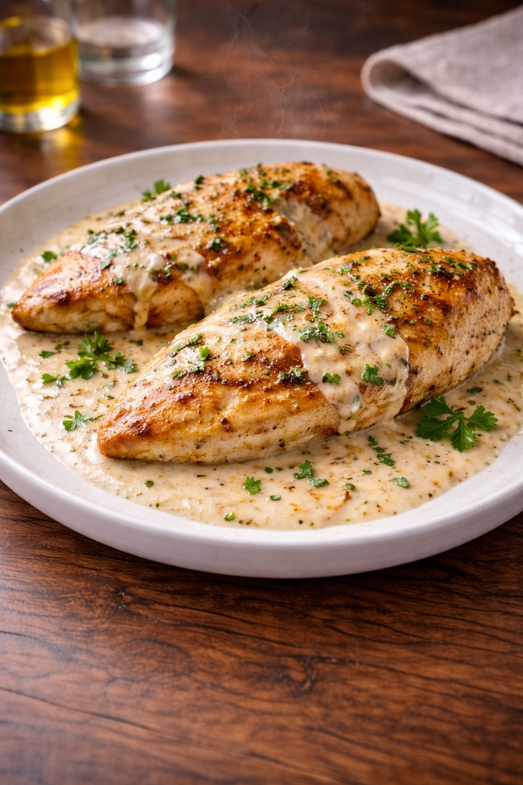 El resultado es un plato delicado, cremoso y muy apetecible. La pechuga de pollo queda tierna y jugosa, protegida por una salsa suave que realza su sabor sin ocultarlo. La crema aporta cuerpo y una sensación reconfortante que invita a comer despacio.