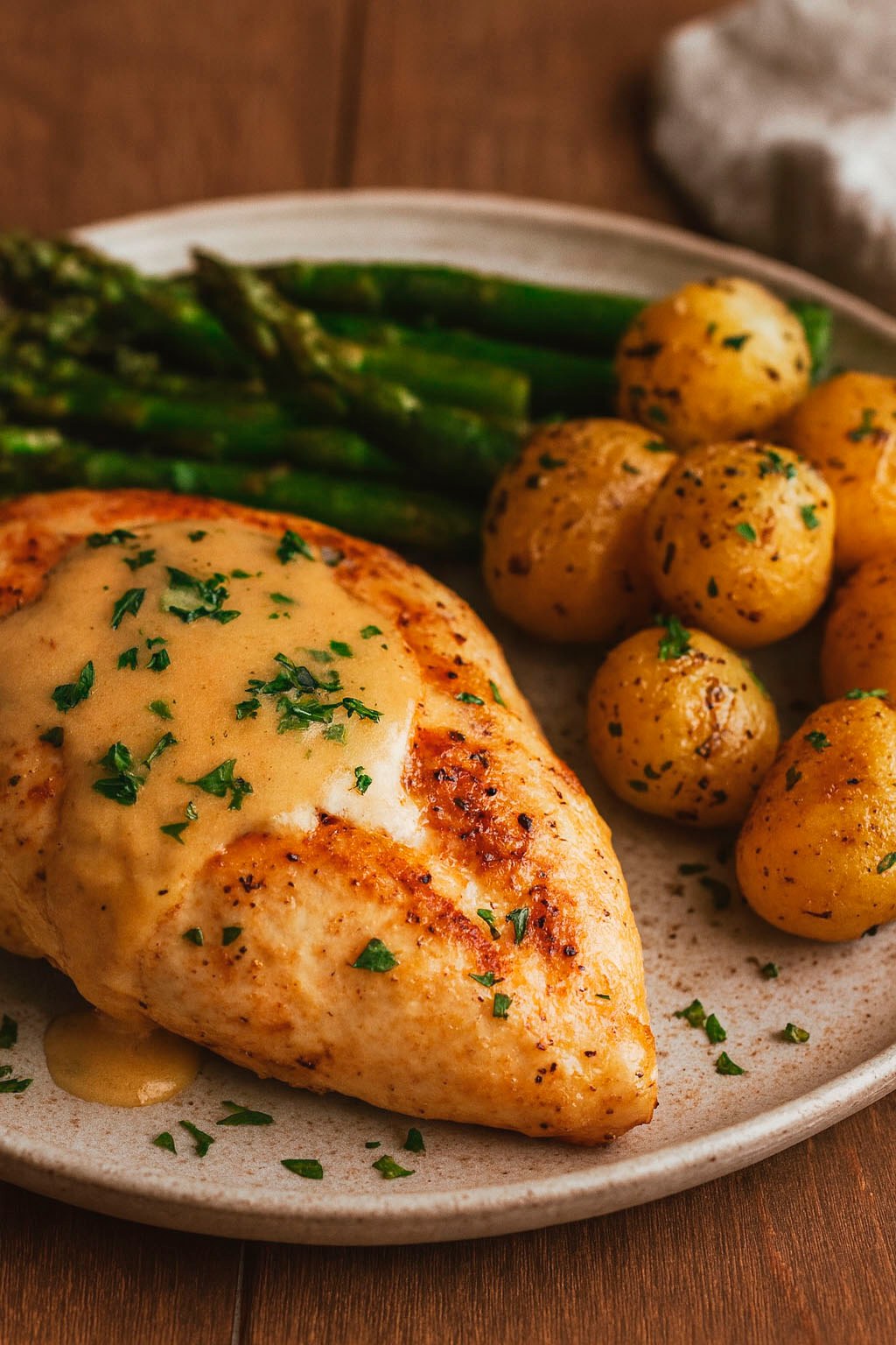 Esta receta une dos mundos: la simplicidad del pollo a la plancha con la profundidad de una salsa de queso artesanal y el toque rústico de unas patatas asadas al estilo mediterráneo. Un plato ideal para cenas familiares, comidas de fin de semana o para sorprender en una mesa especial sin complicaciones.