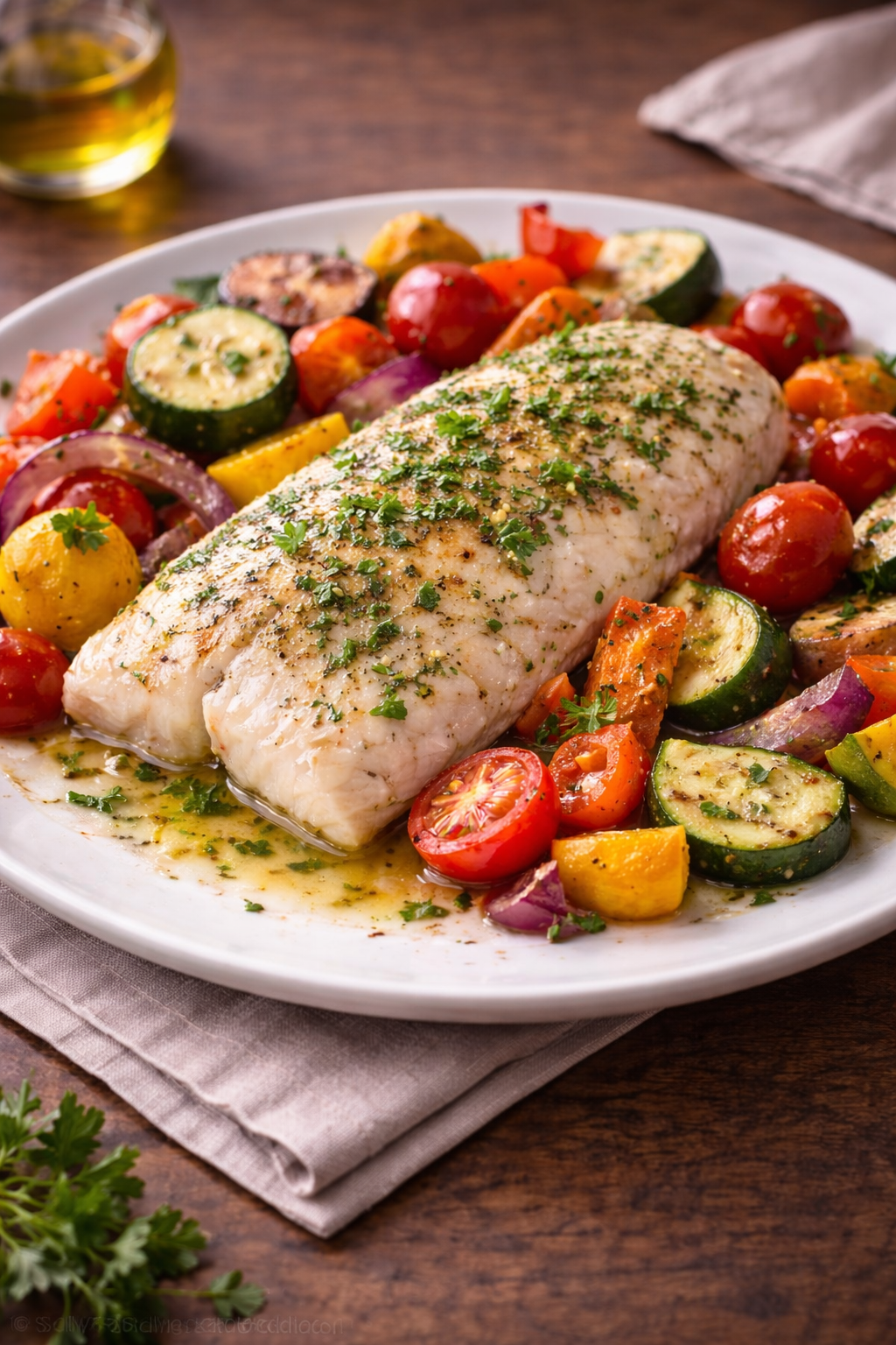 El pescado al horno con verduras ofrece una carne blanca, jugosa y delicada, acompañada de verduras tiernas y ligeramente doradas. Los jugos del pescado se mezclan con el aceite y las hortalizas, creando un fondo aromático y sabroso.