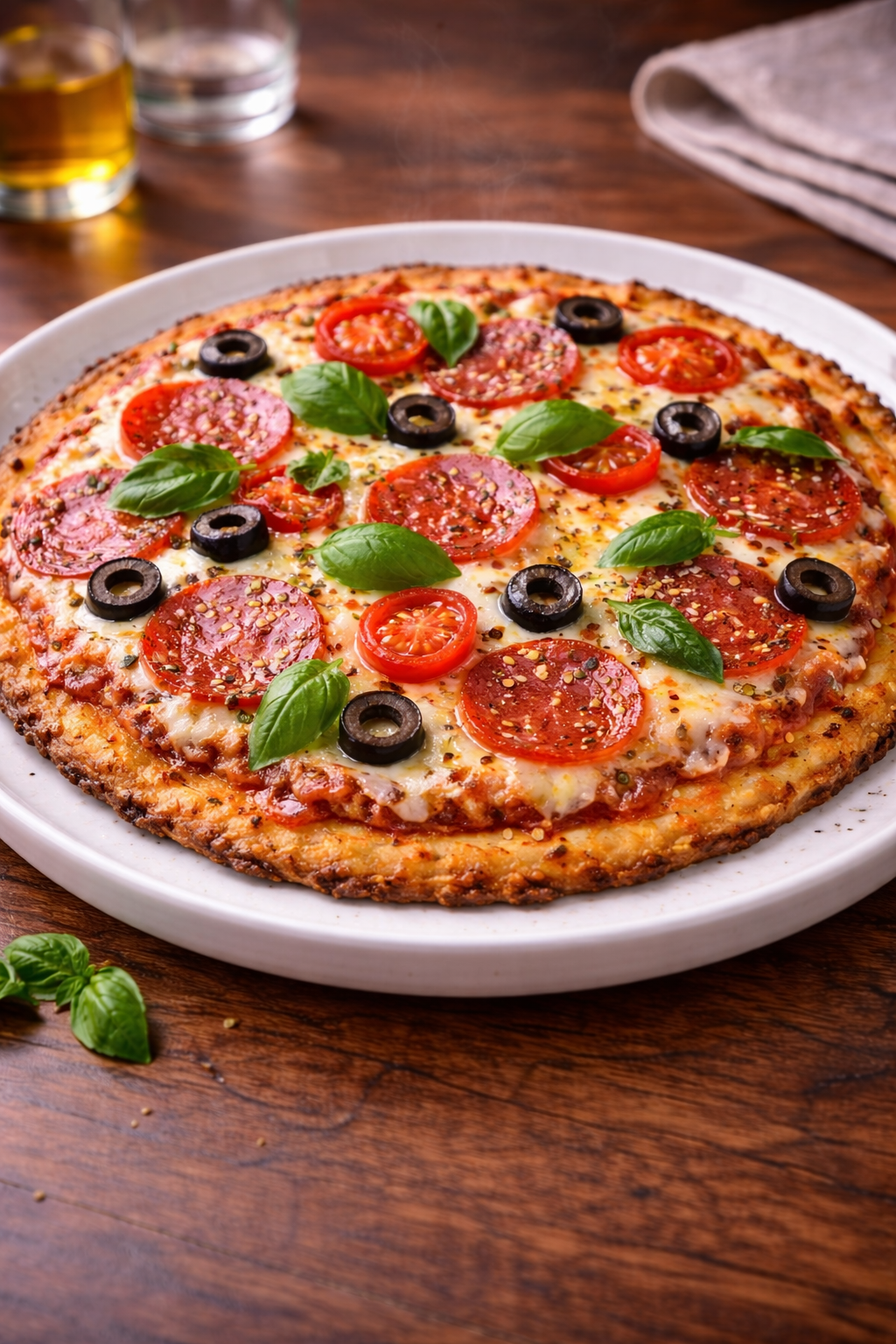 Visualmente, es una pizza atractiva, dorada y apetecible, que no da sensación de sacrificio. Se sirve como una pizza tradicional, en porciones, ideal para compartir o disfrutar en una cena tranquila sin culpa.