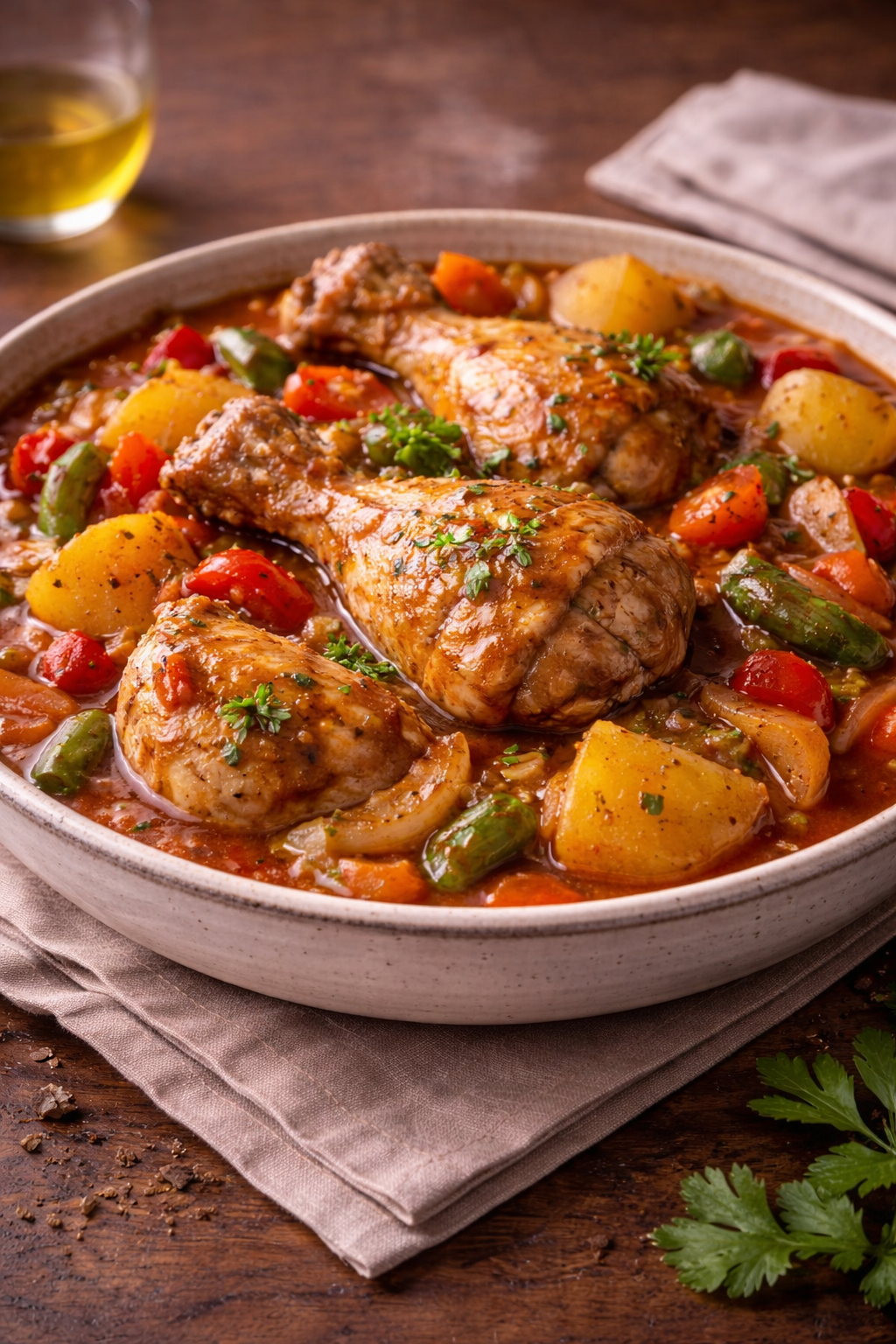 En muchas culturas, el guiso de pollo se convirtió en un plato central de la mesa diaria, adaptándose a los productos locales y a las estaciones del año. Verduras, hierbas y especias se añadían según la región, creando innumerables versiones de una misma idea: alimentar y reconfortar.
