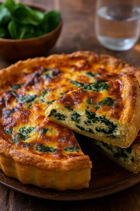 La quiché de espinacas y queso presenta una superficie dorada y atractiva, con un interior cremoso y suave. Al cortarla, se aprecia un relleno bien ligado, donde la espinaca se integra perfectamente con el queso y la base crujiente.