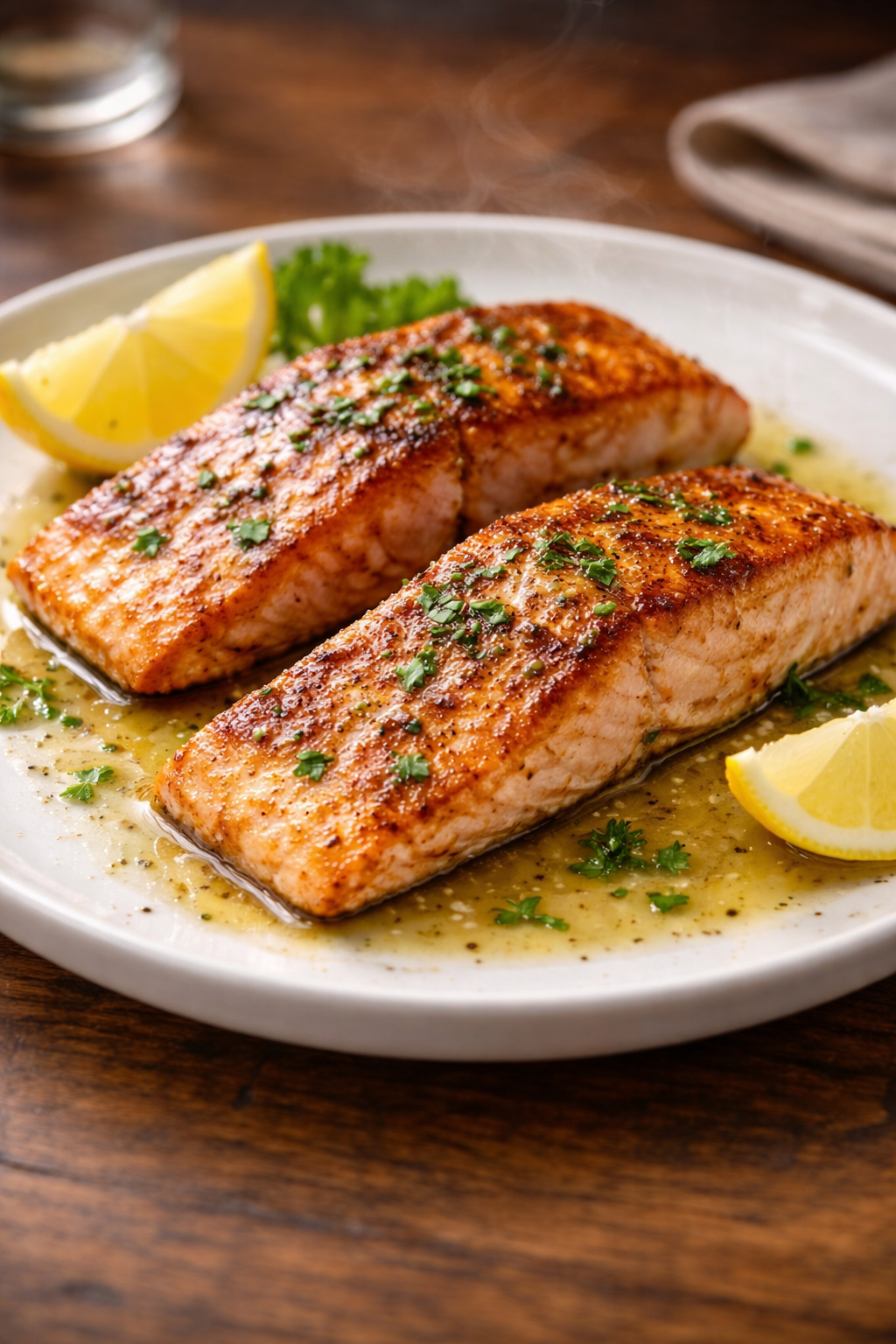 El resultado es un salmón dorado por fuera y jugoso por dentro, con una textura tierna que se separa en lascas suaves. La mantequilla aporta brillo y un aroma envolvente, mientras que la piel crujiente añade contraste.