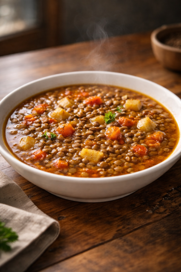 El resultado es una sopa espesa, aromática y llena de matices. Las lentejas quedan suaves pero enteras, rodeadas de un caldo sabroso y ligeramente untuoso. El color es cálido, invitando a sentarse a la mesa sin prisas.