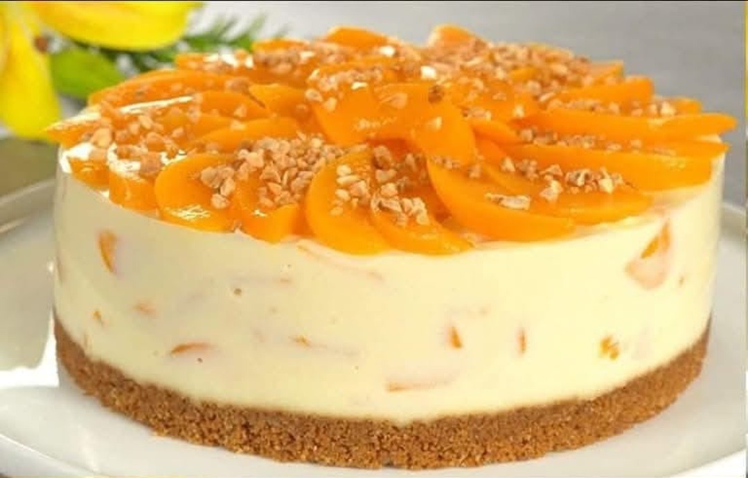 La textura es cremosa, ligera y fresca, con un contraste entre la base crujiente y la capa de melocotón brillante 🌈🍰.