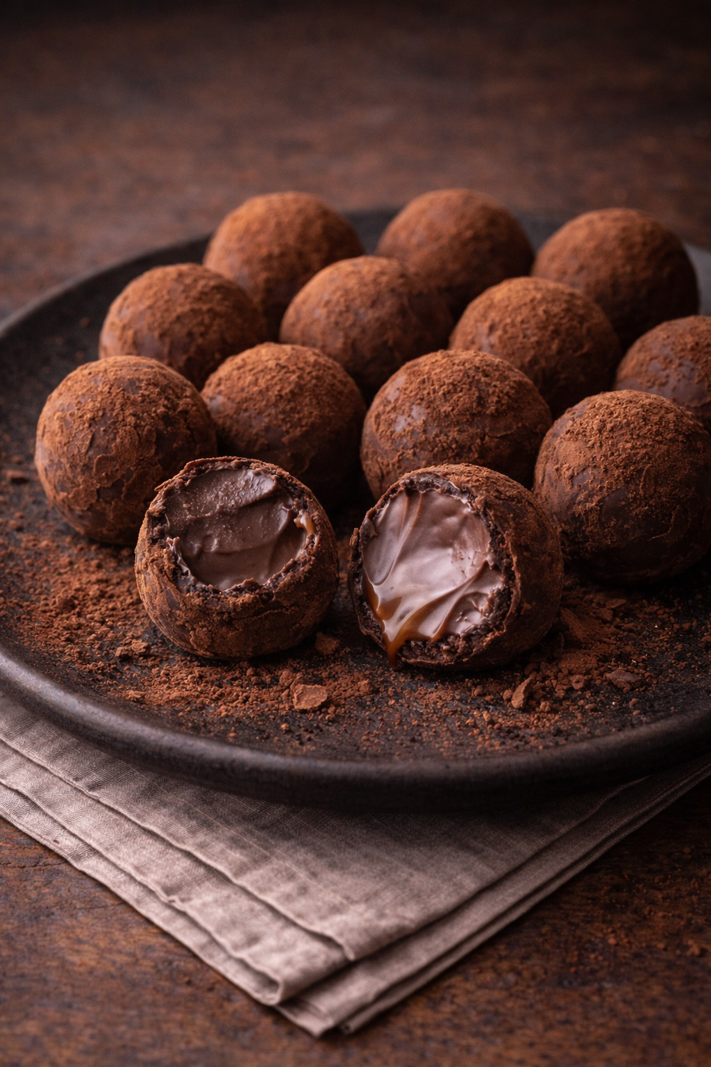 Las trufas de chocolate clásicas presentan un exterior ligeramente irregular, cubierto de cacao, y un interior suave, cremoso e intenso. Al morderlas, se funden lentamente en la boca, liberando todo el sabor del chocolate.